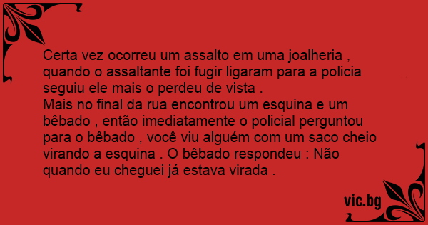Mais no final da rua encontrou um esquina e um bêbado , então imediatamente o policial perguntou para o bêbado , você viu alguém com um saco cheio virando a esquina . O bêbado respondeu : Não quando eu cheguei já estava virada .