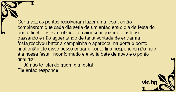 Certa vez os pontos resolveram fazer uma festa, então combinaram que cada dia seria de um,então era o dia da festa do ponto final e estava rolando o maior som quando o asterisco passando e não aguentando de tanta vontade de entrar na festa,resolveu bater a campainha e apareceu na porta o ponto final,então ele disse posso entrar o ponto final respondeu não hoje é a nossa festa. Inconformado ele volta bate de novo e o ponto final diz: