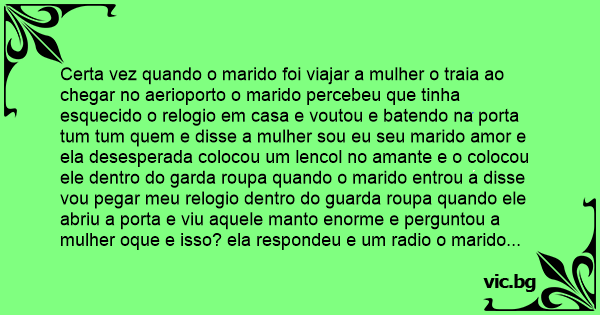 Certa vez quando o marido foi viajar a mulher o traia ao chegar no aerioporto o marido percebeu que tinha esquecido o relogio em casa e voutou e batendo na porta tum tum quem e disse a mulher sou eu seu marido amor e ela desesperada colocou um lencol no amante e o colocou ele dentro do garda roupa quando o marido entrou a disse vou pegar meu relogio dentro do guarda roupa quando ele abriu a porta e viu aquele manto enorme e perguntou a mulher oque e isso? ela respondeu e um radio o marido falou vamos ver se funciona e torceu as bolas do amante a mulher para parecer de verdade gritou fm do povo e o amante falou ta duendo meus ovo.