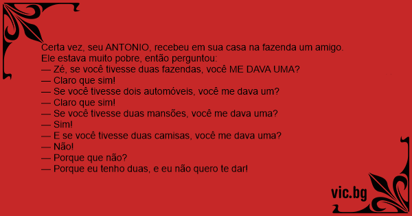 Certa vez, seu ANTONIO, recebeu em sua casa na fazenda um amigo.