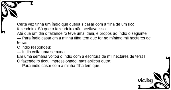 Certa vez tinha um índio que queria s casar com a filha de um rico fazendeiro. Só que o fazendeiro não aceitava isso.