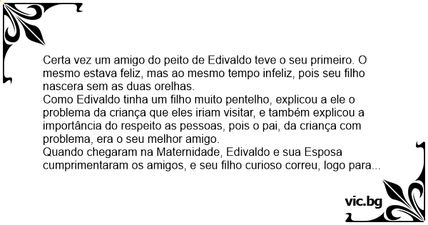 Certa vez um amigo do peito de Edivaldo teve o seu primeiro. O mesmo estava feliz, mas ao mesmo tempo infeliz, pois seu filho nascera sem as duas orelhas.