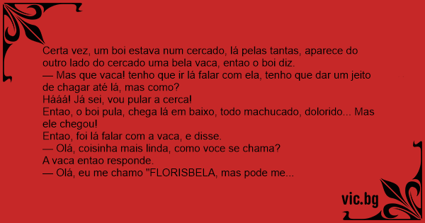 Certa vez, um boi estava num cercado, lá pelas tantas, aparece do outro lado do cercado uma bela vаса, entao o boi diz.