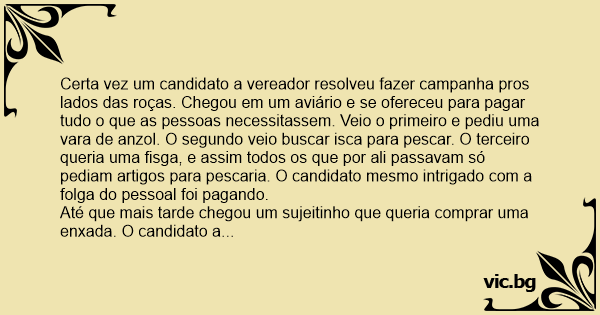 Certa vez um candidato a vereador resolveu fazer campanha pros lados das roças. Chegou em um aviário e se ofereceu para pagar tudo o que as pessoas necessitassem. Veio o primeiro e pediu uma vara de anzol. O segundo veio buscar isca para pescar. O terceiro queria uma fisga, e assim todos os que por ali passavam só pediam artigos para pescaria. O candidato mesmo intrigado com a folga do pessoal foi pagando.
