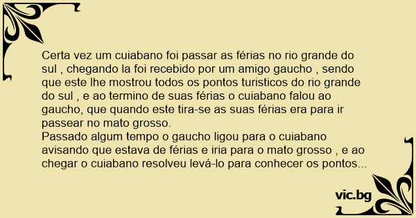 Certa vez um cuiabano foi passar as férias no rio grande do sul , chegando la foi recebido por um amigo gaucho , sendo que este lhe mostrou todos os pontos turisticos do rio grande do sul , e ao termino de suas férias o cuiabano falou ao gaucho, que quando este tira-se as suas férias era para ir passear no mato grosso.