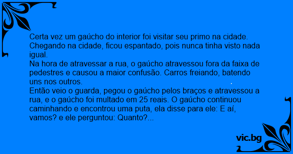 Então veio o guarda, pegou o gaúcho pelos braços e atravessou a rua, e o gaúcho foi multado em 25 reais. O gaúcho continuou caminhando e encontrou uma рuта, ela disse para ele: E aí, vamos? e ele perguntou: Quanto? Ela respondeu: 50 reais.