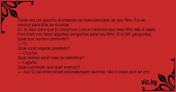 Certa vez um gaucho duvidando da masculinidade de seu filho. Foi ao medico para tirar as duvidas.