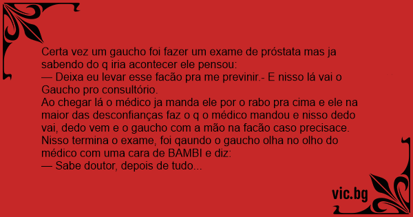 Ao chegar lá o médico ja manda ele por o rаво pra cima e ele na maior das desconfianças faz o q o médico mandou e nisso dedo vai, dedo vem e o gaucho com a mão na facão caso precisace. Nisso termina o exame, foi qaundo o gaucho olha no olho do médico com uma cara de BAMBI e diz: