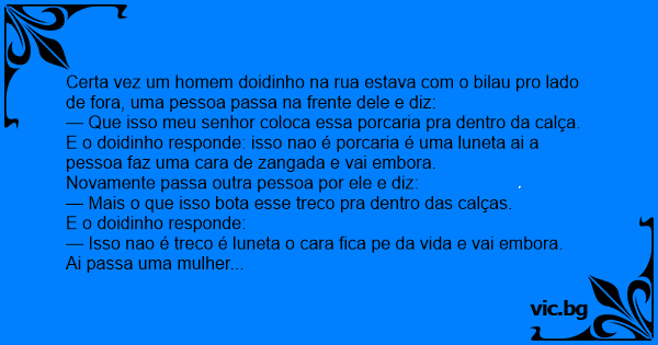 Certa vez um homem doidinho na rua estava com o bilau pro lado de fora, uma pessoa passa na frente dele e diz: