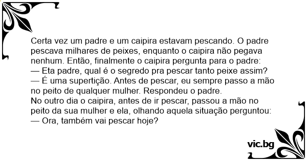 Certa vez um padre e um caipira estavam pescando. O padre pescava milhares de peixes, enquanto o caipira não pegava nenhum. Então, finalmente o caipira pergunta para o padre: