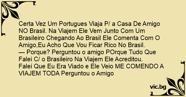 Certa Vez Um Portugues Viaja P/ a Casa De Amigo NO Brasil. Na Viajem Ele Vem Junto Com Um Brasileiro Chegando Ao Brasil Ele Comenta Com O Amigo,Eu Acho Que Vou Ficar Rico No Brasil.