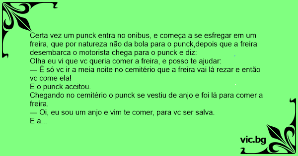 Certa vez um punck entra no onibus, e começa a se esfregar em um freira, que por natureza não da bola para o punck,depois que a freira desembarca o motorista chega para o punck e diz: