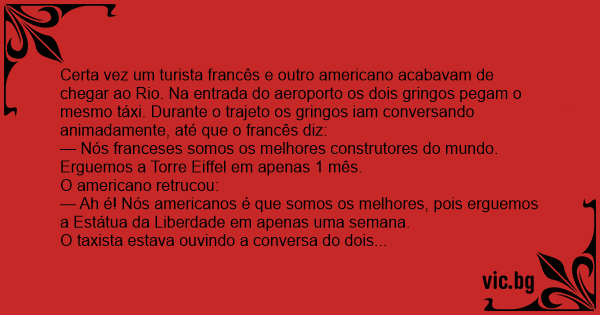 Certa vez um turista francês e outro americano acabavam de chegar ao Rio. Na entrada do aeroporto os dois gringos pegam o mesmo táxi. Durante o trajeto os gringos iam conversando animadamente, até que o francês diz: