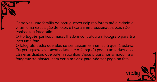 Certa vez uma família de portugueses caipiras foram até a cidade e viram uma exposição de fotos e ficaram impressionados pois não conheciam fotografia.