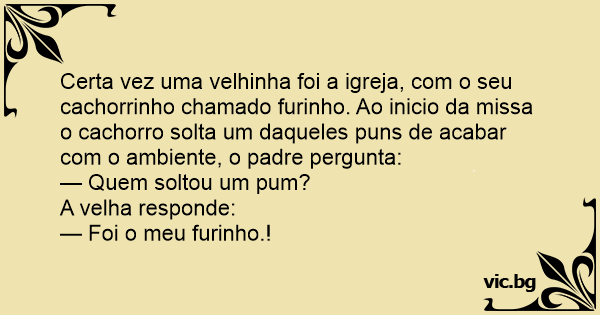 Certa vez uma velhinha foi a igreja, com o seu cachorrinho chamado furinho. Ao inicio da missa o сасhоrrо solta um daqueles puns de acabar com o ambiente, o padre pergunta: