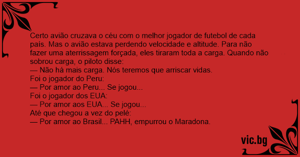 Certo avião cruzava o céu com o melhor jogador de futebol de cada país. Mas o avião estava perdendo velocidade e altitude. Para não fazer uma aterrissagem forçada, eles tiraram toda a carga. Quando não sobrou carga, o piloto disse: