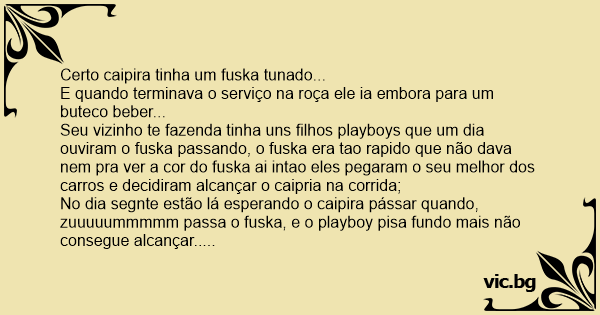 No dia segnte estão lá esperando o caipira pássar quando, zuuuuummmmm passa o fuska, e o рlаyвоy pisa fundo mais não consegue alcançar..