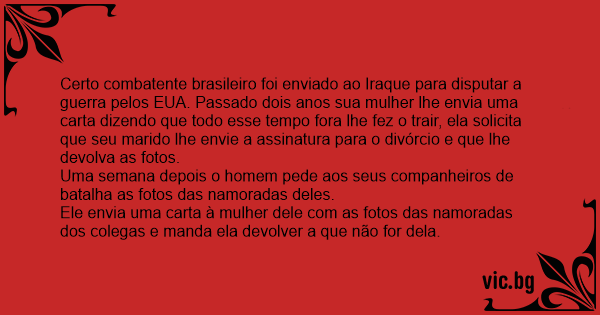 Ele envia uma carta à mulher dele com as fotos das namoradas dos colegas e manda ela devolver a que não for dela.