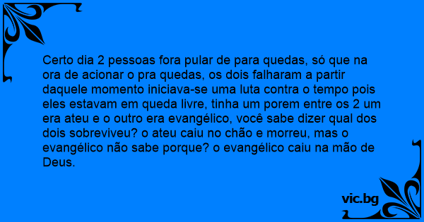 Certo dia 2 pessoas fora pular de para quedas, só que na ora de acionar o pra quedas, os dois falharam a partir daquele momento iniciava-se uma luta contra o tempo pois eles estavam em queda livre, tinha um porem entre os 2 um era ateu e o outro era evangélico, você sabe dizer qual dos dois sobreviveu? o ateu caiu no chão e morreu, mas o evangélico não sabe porque? o evangélico caiu na mão de Deus.