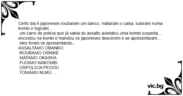 Certo dia 6 japoneses roubaram um banco, mataram o caixa, subiram numa kombi e fugiraM...