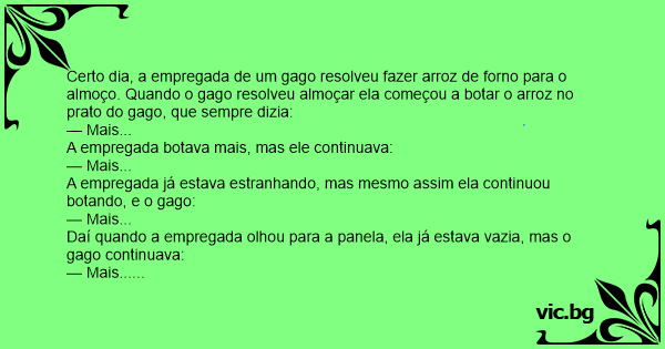 Certo dia, a empregada de um gago resolveu fazer arroz de forno para o almoço. Quando o gago resolveu almoçar ela começou a botar o arroz no prato do gago, que sempre dizia: