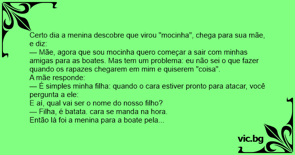 Certo dia a menina descobre que virou "mocinha", chega para sua mãe, e diz: