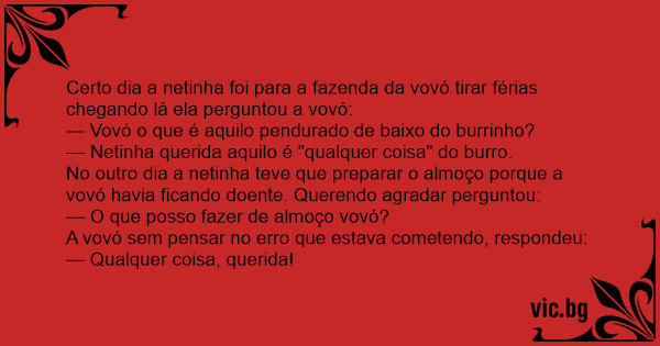 No outro dia a netinha teve que preparar o almoço porque a vovó havia ficando doente. Querendo agradar perguntou: