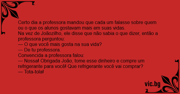 Na vez de Joãozilho, ele disse que não sabia o que dizer, então a professora perguntou: