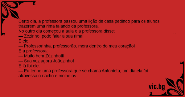 Certo dia, a professora passou uma lição de casa pedindo para os alunos trazerem uma rima falando da professora.