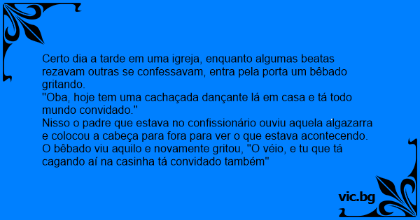 Certo dia a tarde em uma igreja, enquanto algumas beatas rezavam outras se confessavam, entra pela porta um bêbado gritando.