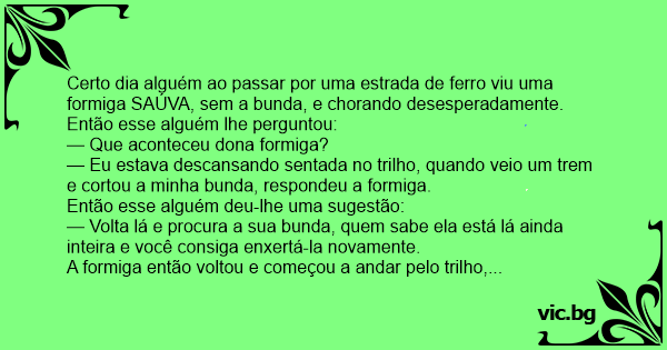 Certo dia alguém ao passar por uma estrada de ferro viu uma formiga SAÚVA, sem a bunda, e chorando desesperadamente.