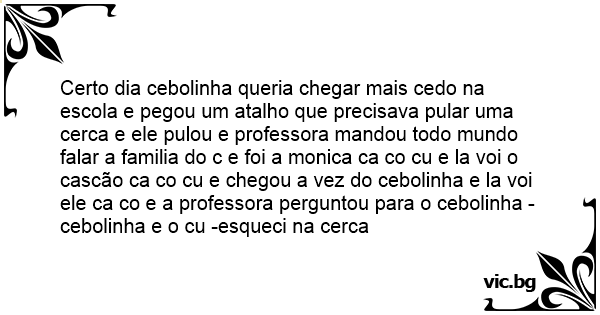 Certo dia cebolinha queria chegar mais cedo na escola e pegou um atalho que precisava pular uma cerca e ele pulou e professora mandou todo mundo falar a familia do c e foi a monica ca co cu e la voi o cascão ca co cu e chegou a vez do cebolinha e la voi ele ca co e a professora perguntou para o cebolinha -cebolinha e o cu -esqueci na cerca