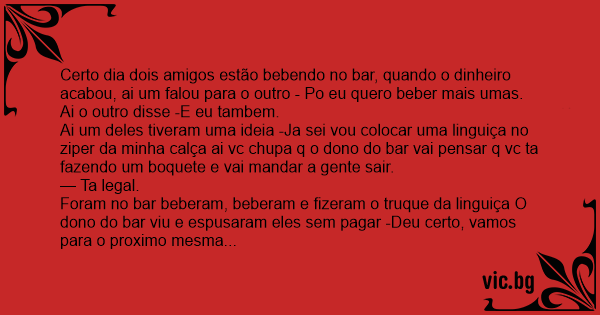 Foram no bar beberam, beberam e fizeram o truque da linguiça O dono do bar viu e espusaram eles sem pagar -Deu certo, vamos para o proximo mesma coisa quando estavam no nono bar o outro disse -po so eu chupa agora vc chupa me da a linguiça Ai o outro disse -Meu tenho q te cofesar uma coisa perdi a linguiça no segundo bar.