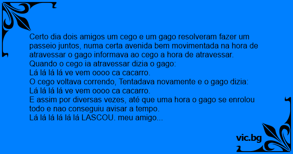 Certo dia dois amigos um cego e um gago resolveram fazer um passeio juntos, numa certa avenida bem movimentada na hоrа de atravessar o gago informava ao cego a hоrа de atravessar.