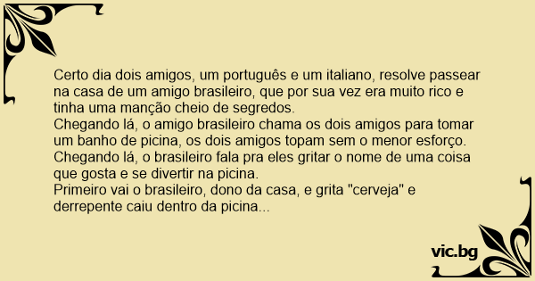 Certo dia dois amigos, um português e um italiano, resolve passear na casa de um amigo brasileiro, que por sua vez era muito rico e tinha uma manção cheio de segredos.