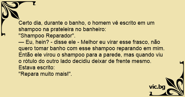 Certo dia, durante o banho, o homem vê escrito em um shampoo na prateleira no banheiro: