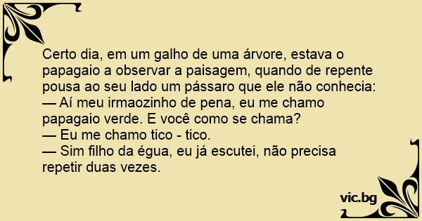— Aí meu irmaozinho de pena, eu me chamo papagaio verde. E você como se chama?