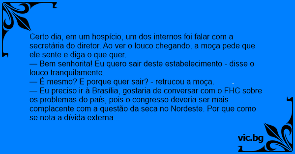 Certo dia, em um hospício, um dos internos foi falar com a secretária do diretor. Ao ver o louco chegando, a moça pede que ele sente e diga o que quer.