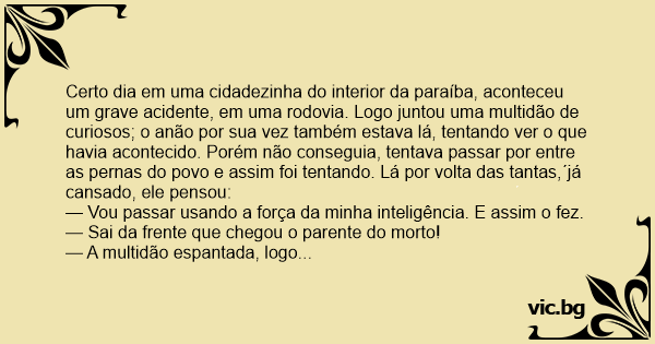 Certo dia em uma cidadezinha do interior da paraíba, aconteceu um grave acidente, em uma rodovia. Logo juntou uma multidão de curiosos; o anão por sua vez também estava lá, tentando ver o que havia acontecido. Porém não conseguia, tentava passar por entre as pernas do povo e assim foi tentando. Lá por volta das tantas,´já cansado, ele pensou: