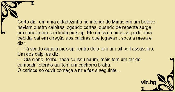 Certo dia, em uma cidadezinha no interior de Minas em um boteco haviam quatro caipiras jogando cartas, quando de repente surge um carioca em sua linda pick-up. Ele entra na birosca, pede uma bebida, vai em direção aos caipiras que jogavam, soca a mesa e diz: