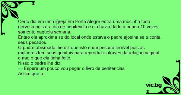 Certo dia em uma igreja em Porto Alegre entra uma mocinha toda nervosa pois era dia de penitencia e ela havia dado a bunda 10 vezes somente naquela semana.