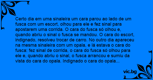Certo dia em uma sinaleira um cara parou ao lado de um fusca com um еsсоrт, olhou para ele e fez sinal para apostarem uma corrida. O cara do fusca só olhou e, quando abriu o sinal o fusca se mandou. O cara do еsсоrт, indignado, resolveu trocar de carro. No outro dia apareceu na mesma sinaleira com um opala, e lá estava o cara do fusca: fez sinal de corrida, o cara do fusca só olhou para ele e, quando abriu o sinal, o fusca arrancou e sumiu da vista do cara do opala. Indignado o cara do opala resolveu trocar de carro, comprou um ômega. No outro dia na mesma sinaleira, lá estava o cara do fusca, o cara do ômega fez sinal de corrida, e, quando abriu o sinal, o fusca sumiu da vista do cara do ômega. Mais indignado ainda, ele resolveu importar um mustang. No outro dia, na mesma sinaleira, lá estava o cara do fusca. O cara do mustang, fez sinal de corrida, e quando abriu o sinal saíram os dois, parelhos, depois de algum tempo o cara do fusca olhou para o lado e lá estava o cara do mustang, então ele olhou para o cara do mustang e disse: