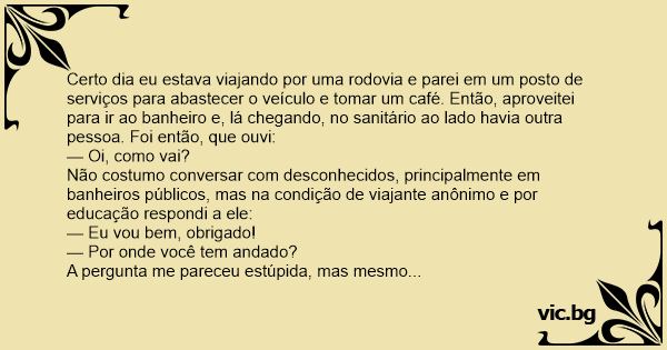 Não costumo conversar com desconhecidos, principalmente em banheiros públicos, mas na condição de viajante anônimo e por educação respondi a ele: