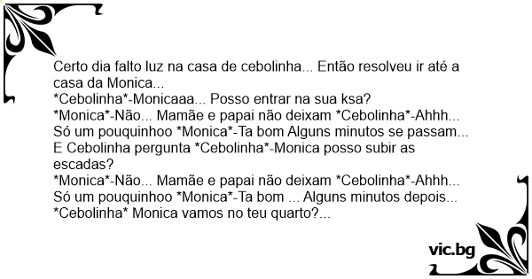 *Monica*-Não... Mamãe e papai não deixam *Cebolinha*-Ahhh... Só um pouquinhoo *Monica*-Ta bom Alguns minutos se passam... E Cebolinha pergunta *Cebolinha*-Monica posso subir as escadas?