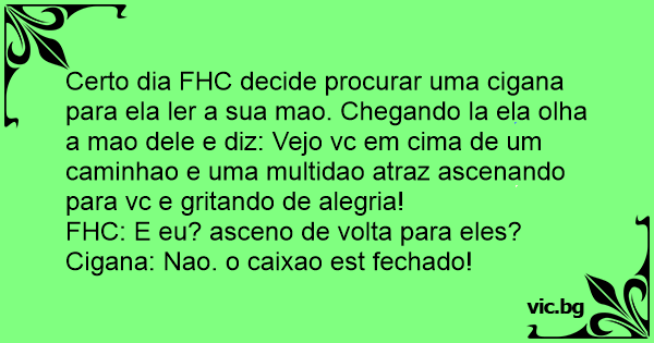 Certo dia FHC decide procurar uma cigana para ela ler a sua mao. Chegando la ela olha a mao dele e diz: Vejo vc em cima de um caminhao e uma multidao atraz ascenando para vc e gritando de alegria!