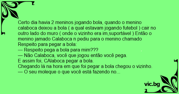Certo dia havia 2 meninos jogando bola, quando o menino calaboca deixou a bola ( a qual estavam jogando futebol ) cair no outro lado do muro ( onde o vizinho era im,suportável ) Então o menino jamado Calaboca n pediu para o menino chamado Respeito para pegar a bola: