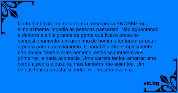 Certo dia havia, no meio da rua, uma pedra ENORME que simplesmente impedia as pessoas passarem. Não agüentando a demora e a fila grande de gente que ficava presa no congestionamento, um grupinho de homens tentaram arrastar a pedra para o acostamento. E nada! A pedra simplesmente não mexia. Vieram mais homens, estes se juntaram aos primeiros, e nada acontecia. Uma carreta tentou amarrar uma corda a pedra e puxá-la, mas também não adiantou. Um ônibus tentou arrastar a pedra, e... mesmo assim a pedra não podia ser movida. E o pessoal começava a se desesperar... Até que chegou uma mulherzinha meio enrugadinha, dobrada e velha, com mãos frágeis, mas com uma unha c o m p r i d a no dedo indicador da mão direita. Ela, vendo a turma desesperada e bloqueada pela pedrona, dirigiu-se a rocha, e, colocando o seu dedo embaixo da pedra, calmamente e sem nenhum esforço a levantou, jogando-a para a beira da rua. E o povo assistiu a tudo, boquiabertos. Moral da história? A UNHÃO FAZ A FORÇA.