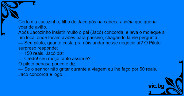Após Jacozinho insistir muito o pai (Jacó) concorda, e leva o moleque a um local onde locam aviões para passeio, chagando lá ele pergunta: