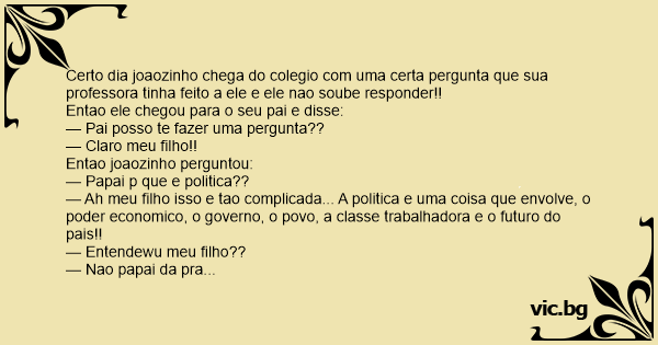 Joãozinho estava estudando na escola o tema "politica" e ele tinha que fazer um trabalho mas ele naum prestou atenção e foi pedir ajuda para seu pai. — Pai!! me esplique esse trem de politica que...