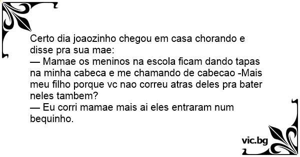 — Mamae os meninos na escola ficam dando tapas na minha cabeca e me chamando de cabecao -Mais meu filho porque vc nao correu atras deles pra bater neles tambem?